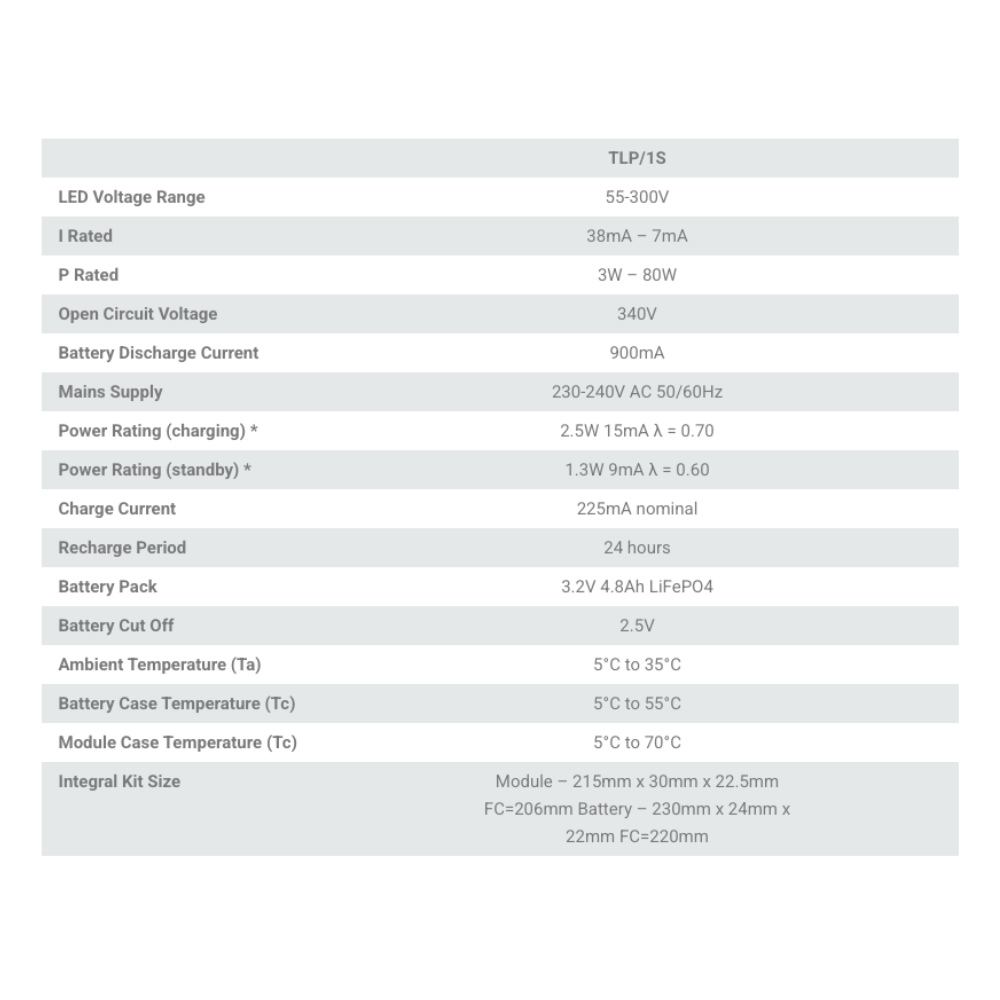 The TLP/1S intelligently adjusts its output current to optimise the balance between battery performance and load requirements, ensuring maximum light output and full emergency duration. It comes equipped with a green LED charge-status indicator and includes built-in temperature monitoring for enhanced safety and battery protection.